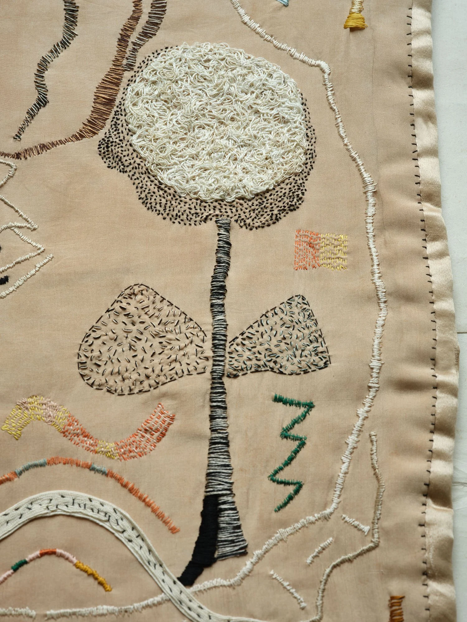 You will be working directly onto a piece of natural fabric. This base fabric is included in the kit provided at the start of the class. Your kit also contains a selection of pre-cut fabric motifs designed by Jessie ready for you to appliqué directly onto your work, plus a printed stitch guide for you to take home.