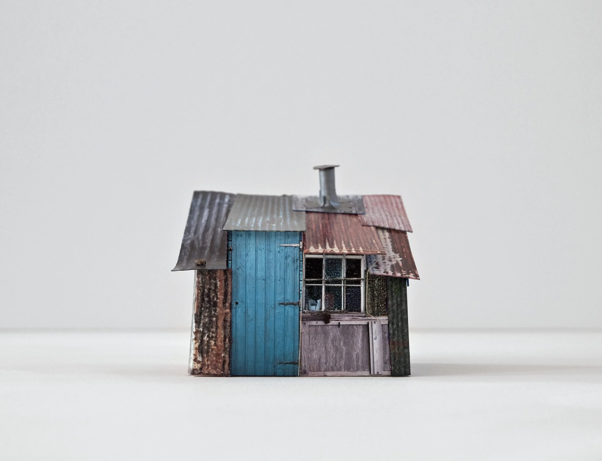 gimme shelter is a series of micro structures which re-imagine the idea of the Welsh Tŷ Unnos (One Night House) for the present day. The original tradition stated that if a house could be built on common land between the hours of sunset and sunrise and have smoke emerging from its chimney at dawn, then the house could be kept along with the land enclosed by a hammer throw from the four quarters. Built from digital photographs and found materials, the models explore the idea of architecture as a metaphor for life in the 21st Century.