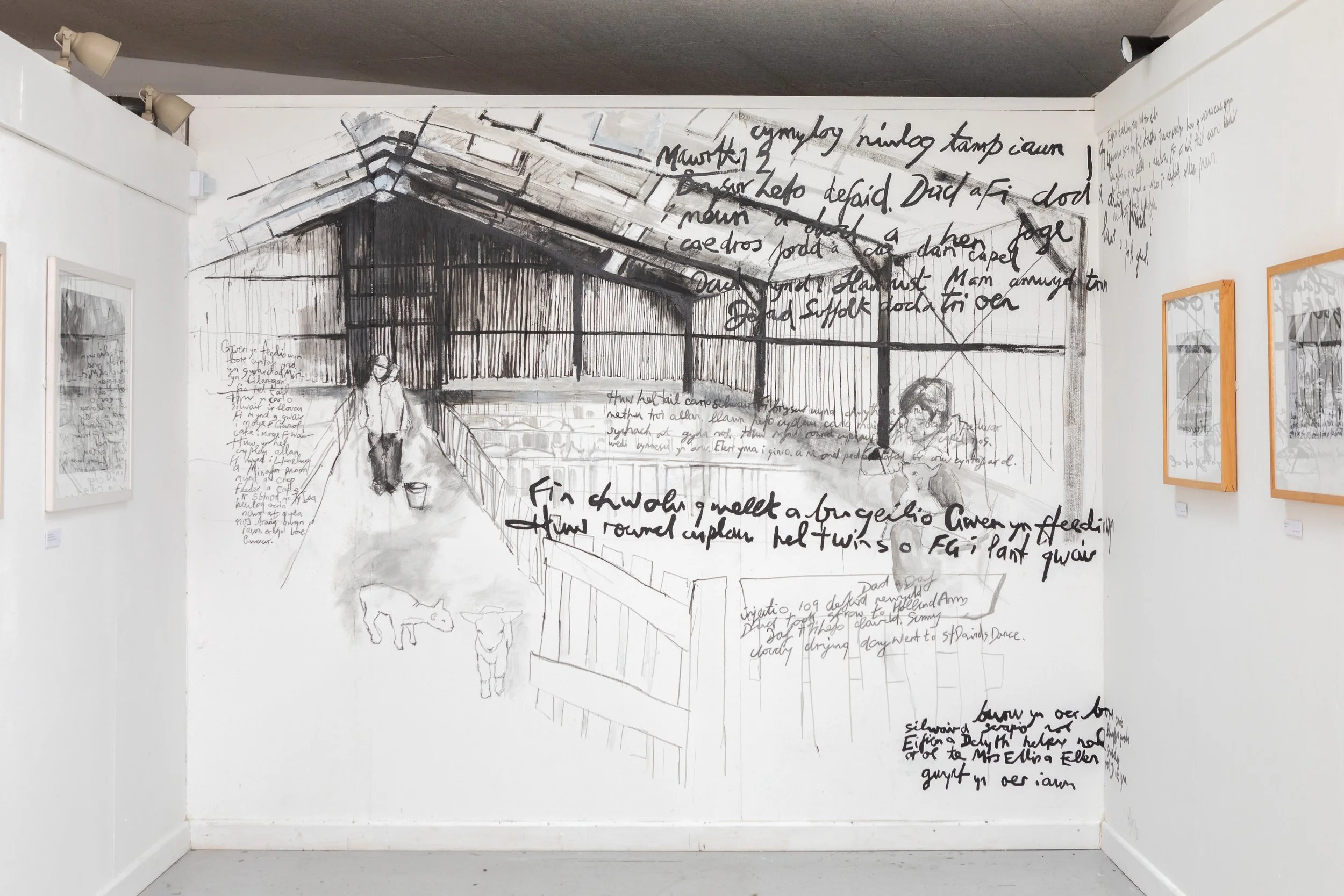Eleri Jones’s recent prints and mixed media works are inspired by growing up on the family farm in Trofarth, near Llanrwst in the Conwy valley, and in particular the lambing season. She explains that these two months are the busiest and most exhausting, yet the happiest time of the year for her family when they all pull together. Life on the farm follows a yearly pattern with the changing seasons which Eleri’s father has noted in his diaries over the decades; his careful record keeping reveals small changes in the climate and farming which have happened over the years. The prints combine her father’s handwriting with images of the lambing shed and everyday farm life, often focusing on the relationships within the family and how they have evolved over time, from her parents’ close partnership working alongside their sons developing an effective pattern and rhythm to the sharing of knowledge with the grandchildren and the respect and care for the lambs and sheep. They also show the adventure and fun that can be part of farm life.