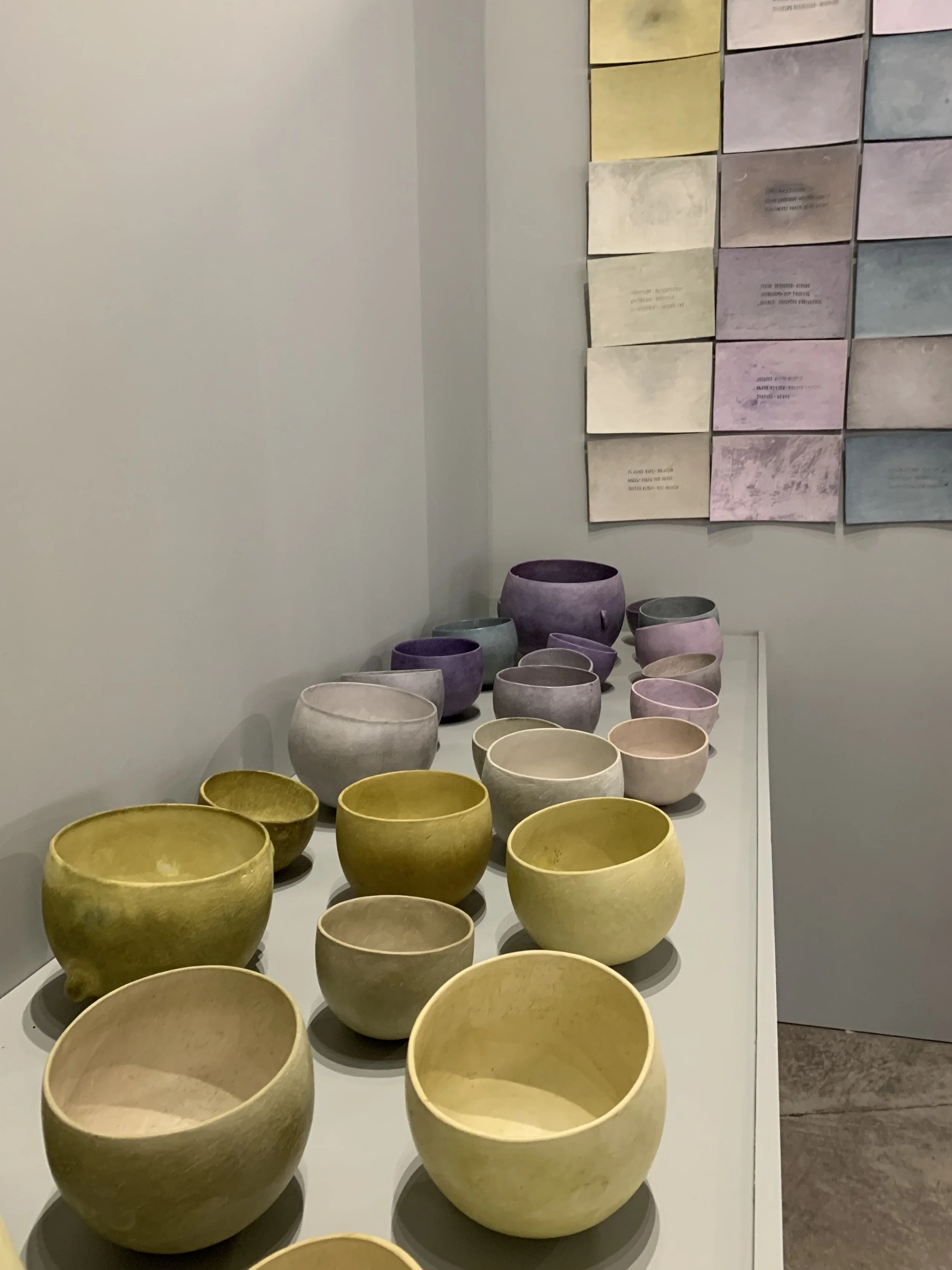 ‘Rwyf wedi bod yn gweithio mewn monocrom ers sawl degawd ac yn ddiweddar rwyf wedi eisiau ail-archwilio lliw, ond roeddwn wedi fy rhwystro a braidd yn ofnus ohono. Yn sydyn roeddwn yn cael fy anrhegu â lliw o’r un pridd a rhoddodd yn fy nghlai i mi, ac roedd y lliwiau tyner yn llonni fy nghalon. Oni allai’r pigmentau gael eu hamsugno i arwyneb ceramig mandyllog? Cefais fy hun ar yr un siwrnai ddarganfod drwy risg, mentro a methu roedd tanio â mwg wedi rhoi i mi sawl degawd yn gynt a sylweddolais fy mod yn gallu creu palet lliw heb ddefnyddio cemegau wedi’u llunio’n fasnachol. Mae rhythmau tymhorol y ddôl yn symudol ac yn fyrhoedlog fel y mae pigmentau wedi’u distyllu sy’n medru newid gan ddibynnu ar olau ac amser.’